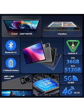 1 Tablette méga écran 14 Pouces NEUVE sous Android 15 octo-core avec 5G Wi-Fi 6, 36 Go RAM + 512 Go ROM